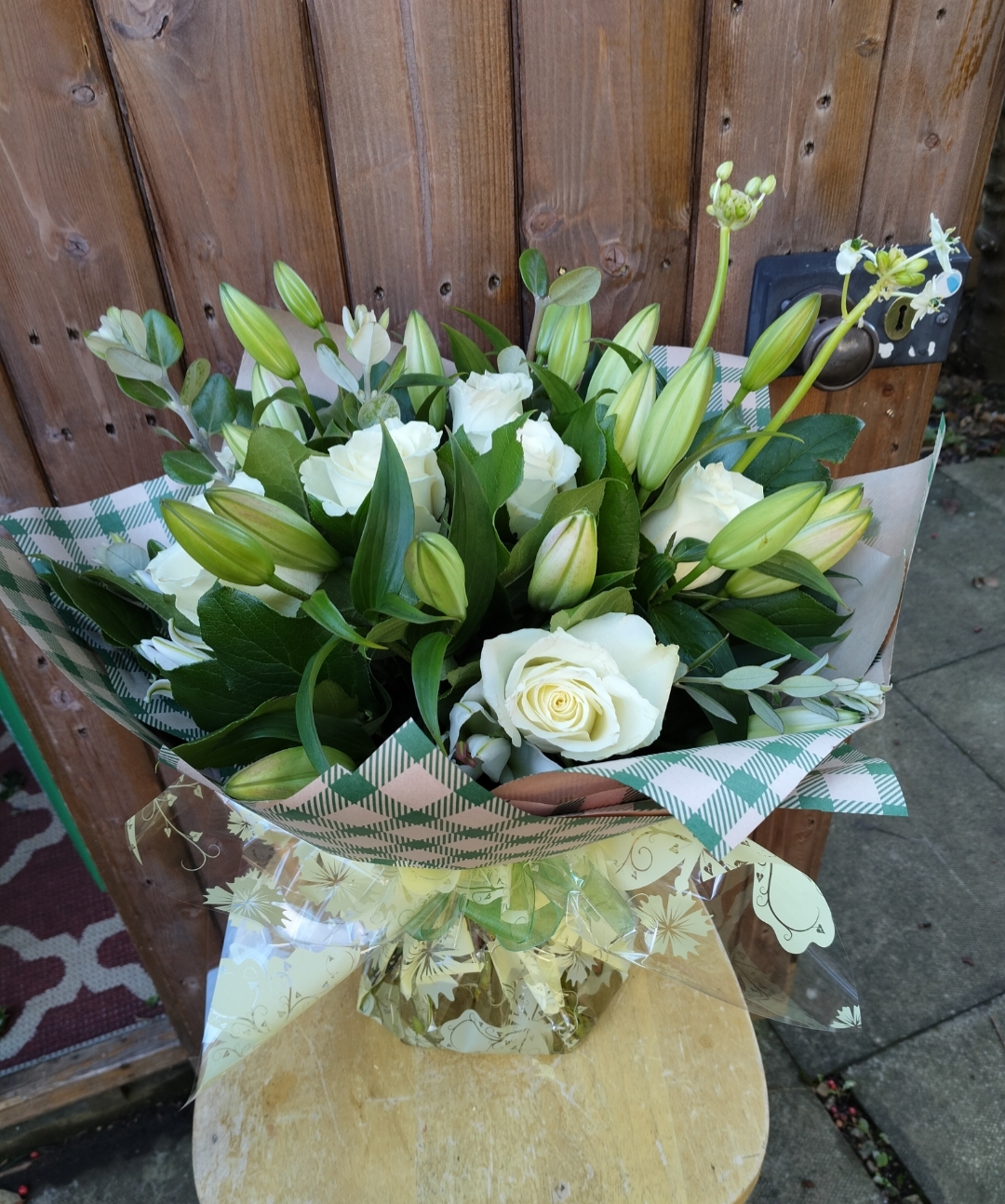 Hand tied Oriental White Lilies and large headed White Roses with mixed foliages.
