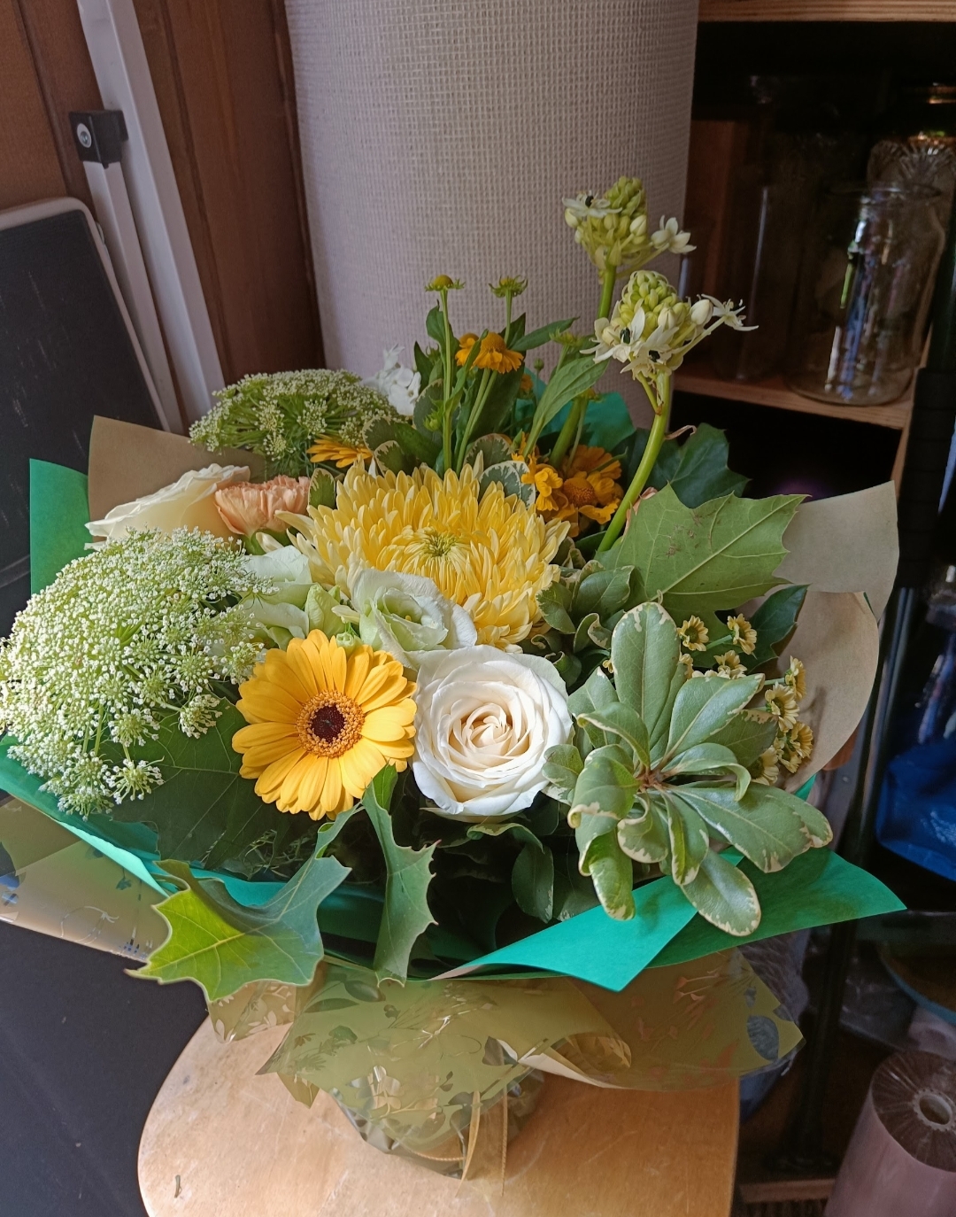 Hand tied bouquet of Yellow and Green flowers and mixed foliages.